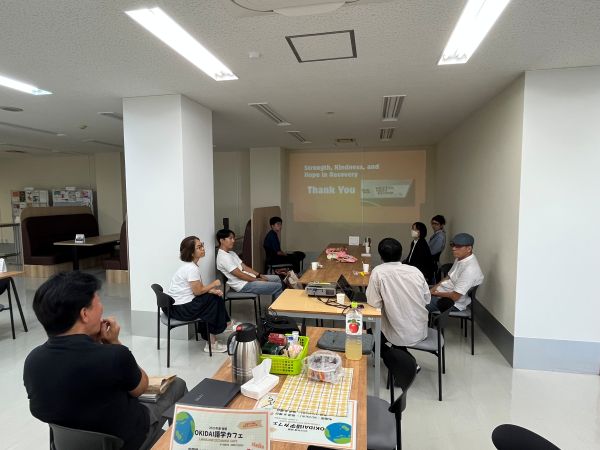 沖縄大学では国際交流室主催でお昼休みの時間に、お弁当などを食べながらの語学交流会「語学カフェ」を開催しています。(毎週水曜日:中国語、毎週金曜日:英語、不定期で韓国語、ベトナム語など)