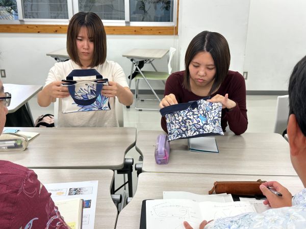 今回はトートバックとポーチ、湯呑、お箸の4点が商品化される予定で、学生たちは試作品を手にとり、販売価格の確認、また湯呑は実際に温かいものや冷たいものをいれて、手触りの確認も行いました。完成した商品は12月の九州矯正展にて販売する予定です。