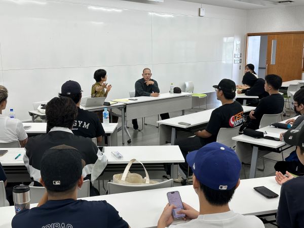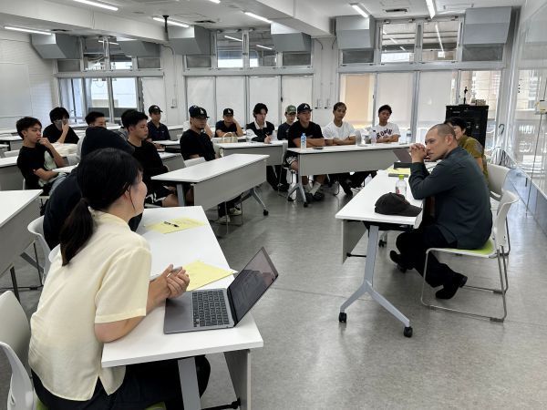 小野ゼミでは今年度、2年生は「糸満の市場とかまぼこ」について、3年生は「沖縄の漁業」について調査しています。入慶田本さんは若手漁師の育成のため、現場の状況を説明する教科書のような動画がつくれればとスターリンクを使って2年前からYouTubeをはじめたとのこと。現在は平均視聴回数2万回を数える人気のYouTubeチャンネルを運営しています。今日は、キャリアとしての漁師や、近年の漁をめぐる状況、今後のビジネスの展開などについてお話しくださいました。25歳で漁師になり、29歳で独立し会社を設立した入慶田本さん、月の15日は航海に出て、日々体調管理に努めているなど、初めて知る漁師の生活について学生たちは真剣に耳を傾けていました。