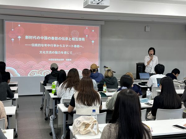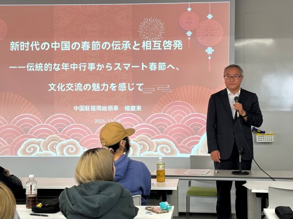 11月10日、国際コミュニケーション学科教授の王志英先生の講義「中華圏事情」では、中国駐福岡総領事館、楊慶東総領事をゲスト講師にお招きし『新時代の中国の春節の伝承と相互啓発 』と題した特別講義を行いました。