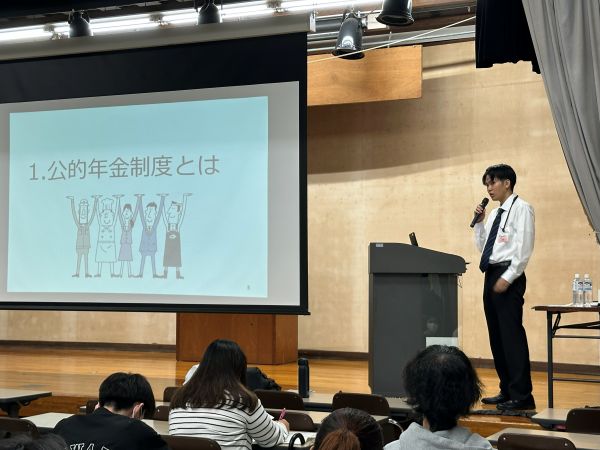 島袋先生の講義では公的年金制度について学び、自分の人生を考えライフプランシミュレーションを描くきっかけにしてほしいと特別講義を実施しています。今回は制度の仕組みや社会的背景について、納付、免除手続きの仕方について説明がなされました。制度については、公的年金制度を「桃太郎」のお話に例えたアニメーション動画も用いられ、講師からは金融リテラシーの知識を得ることが、夢を計画的に叶える第一歩として必要だとアドバイスがありました。