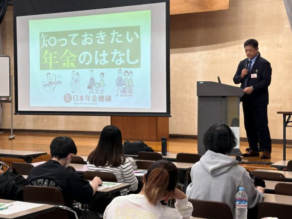 受講した学生からは「年金制度の仕組みが改めて理解できました」、「納付通知がきていたけれど学生だから勝手に免除になると思っていました、手続きしないと損をすることを知れてよかったです」等と、感想が寄せられ、学生たちにとって、年金事務所の役割や公的年金制度への理解を深める貴重な機会となりました。