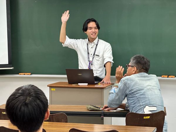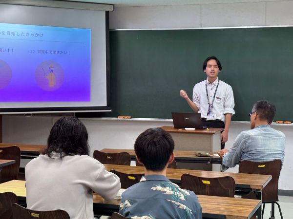 上原さんは、昨年12月に日本語教員試験に合格し、4月から専門学校ITカレッジ沖縄に採用がきまり、日本語教師として働いています。今日は日本語教師を目指したきっかけや学生時代にやっておけばよかったこと、授業や実習で印象に残っていること、そして卒論についてお話くださいました。高校時代は管理栄養学科を目指して、県内で唯一管理栄養士養成校の沖縄大学に進学を決めていたそうですが、高校2年生のときに修学旅行で東京へいき、そのときに「日本は狭い」と感じ、もっと広い世界で働ける仕事をと思い日本語教師への夢を目標にしたそうです。進路決定時に、沖縄大学は日本語を主専攻で学べる県内唯一の大学と知り、沖縄大学に進学したと話してくれました。就職活動に対しては、採用募集時期などについて説明があり、面接の際にどのようなテーマで卒論を書いたか、聞かれることもあるので、興味関心があるテーマで卒論に取り組むようにとのアドバイスもありました。