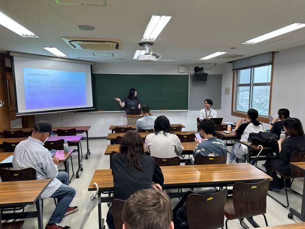 履修学生の半数以上が日本語教師を目指している授業とあって、学生たちは真剣なまなざしで先輩の話をきいていました。上原さんの講話は、話し方もとても丁寧でわかりやすく、学生たちにとってとても有意義な時間となったようでした。
