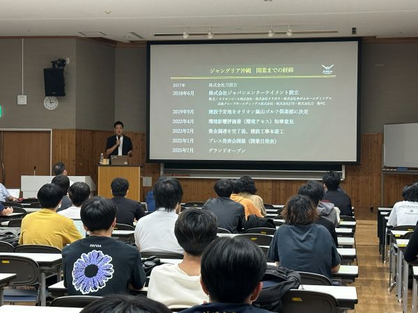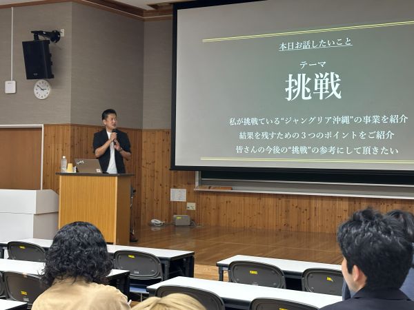 今回の講演会は、昨年度卒業した経法商学科の学生が発案し実現したもので、講演会では、ジャングリア沖縄の開業までの経緯やオープン後の状況、そしてこれからの挑戦についてお話いただきました。沖縄のブランド価値の向上のための戦略、観光業の発展のための仕掛けづくり、課題に対しては調査と予測を重ねて早い段階から解決策を練り続けた姿勢など、加藤さんが沖縄にこだわり、沖縄に貢献をと挑みつづけている熱い想いをお話いただき、とても貴重な講演会となりました。