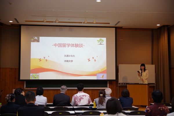 県内の大学生・高校生、引率教員、大学関係者など計45人が参加し、大学生、高校生計8人がそれぞれ中国訪問の体験や学びを発表する「2025年沖縄県青少年友好訪中団報告会」が11月9日に本学で開催されました。本学の上運天美鈴さん、久高ひなたさん研修旅行と留学体験について発表しました。当日は中国駐福岡総領事館の楊総領事をはじめとする来賓の方々も出席され、参加者の報告に熱心に耳を傾けられました。参加者からは「実際に現地を訪れて交流を通していく中で、中国に対して抱いていた印象が変わった」などの声が寄せられ、中には訪中団参加をきっかけに中国語学習を始めた学生もいるようでした。