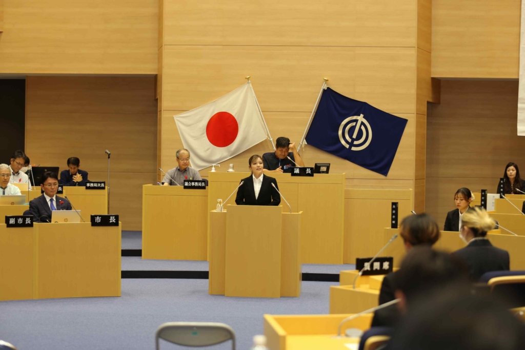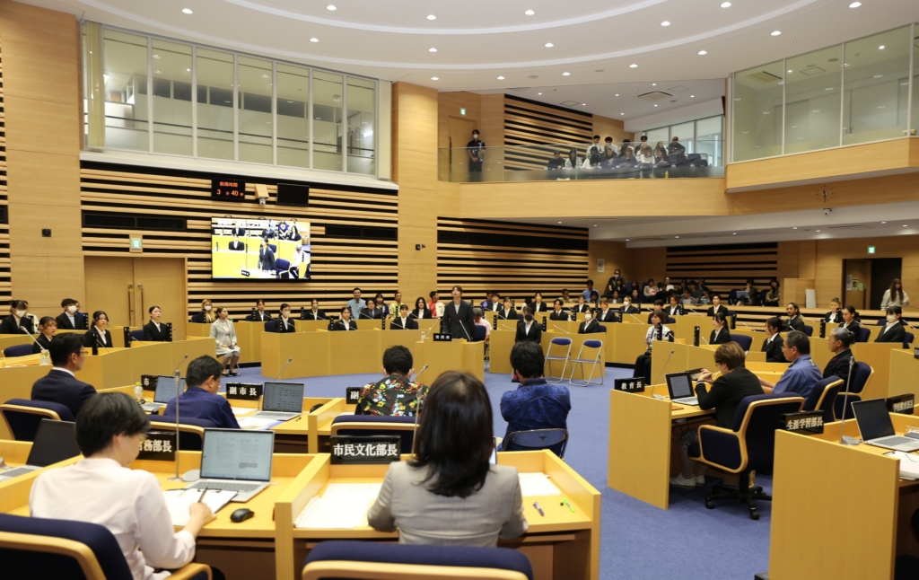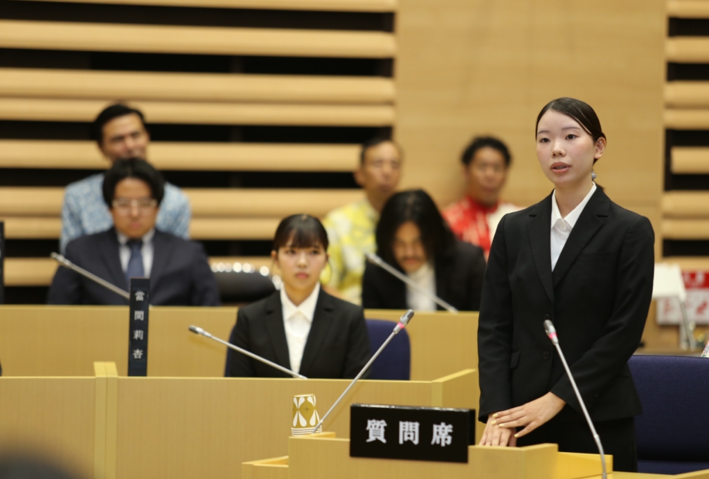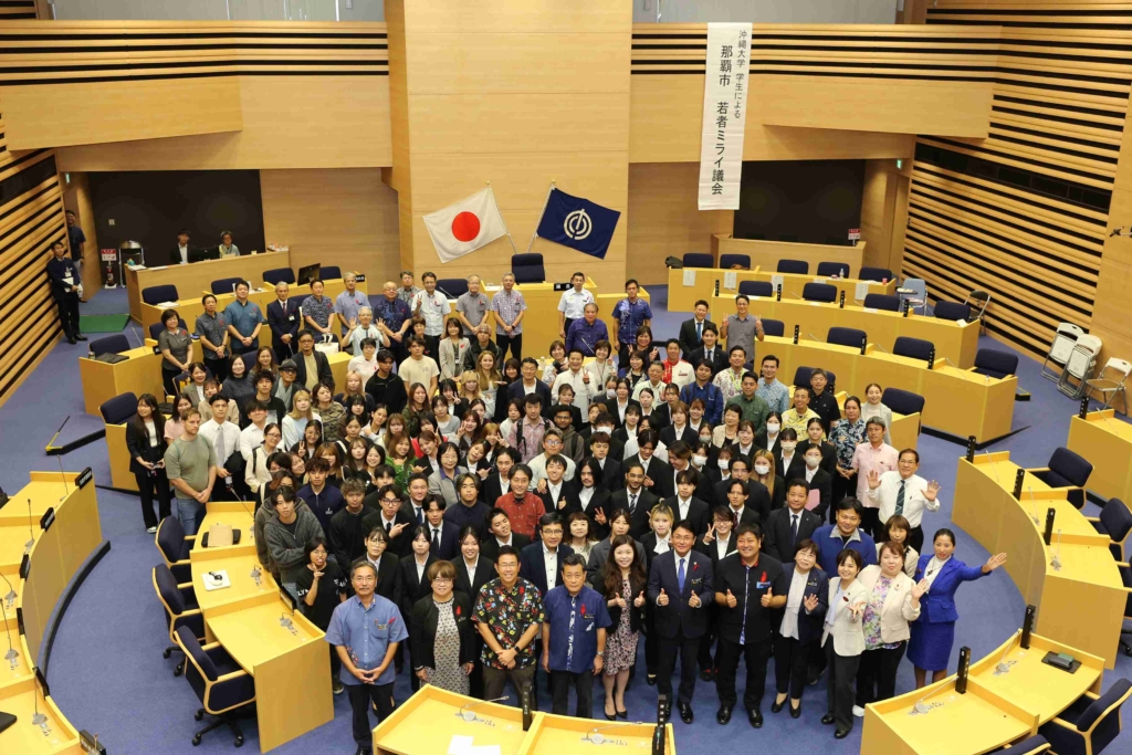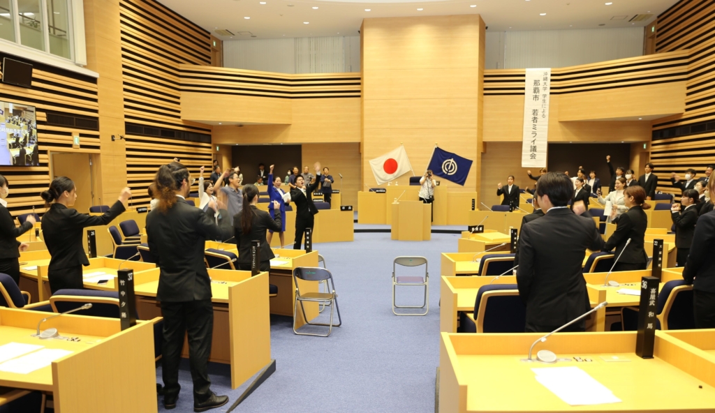 本日は、知念覚市長はじめ、那覇市の部局長の皆様にお迎えいただき、こうして本学の学生が県都那覇市の議会議場で「那覇市若者ミライ議会」の議員を務めさせていただくことに心より感謝を申し上げます。