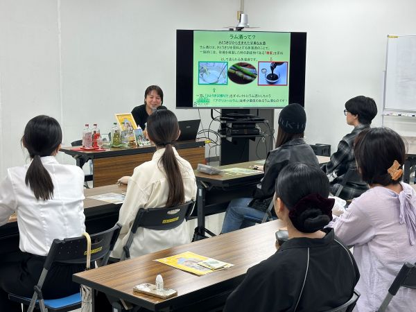 参加者の多くが管理栄養学科の学生だったこともあり、金城さんがラム酒を手掛けることになったきっかけや南大東島にこだわった理由、製造方法、ラム酒が有名なお菓子の原料になっていることなどについての話に、真剣に耳を傾けていました。