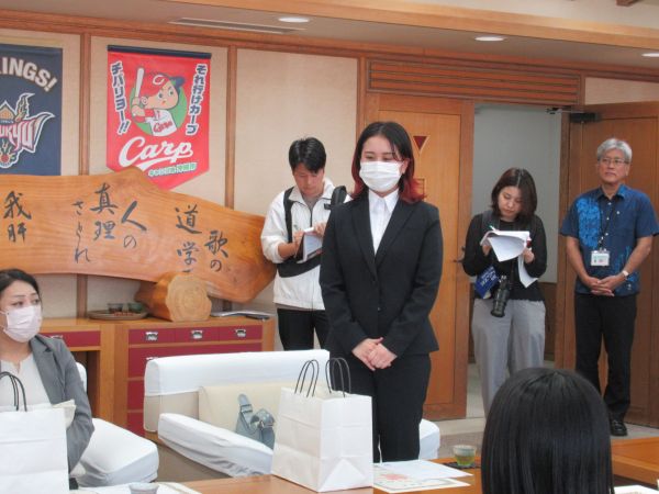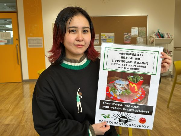 夢に向かってがんばっている学生を紹介する『ピカリと輝く沖大生!』企画。今回は、先月(11月26日)沖縄市健康レシピコンテストで2位にあたる優秀賞に選ばれた管理栄養学科の泉舞華さんを紹介します。