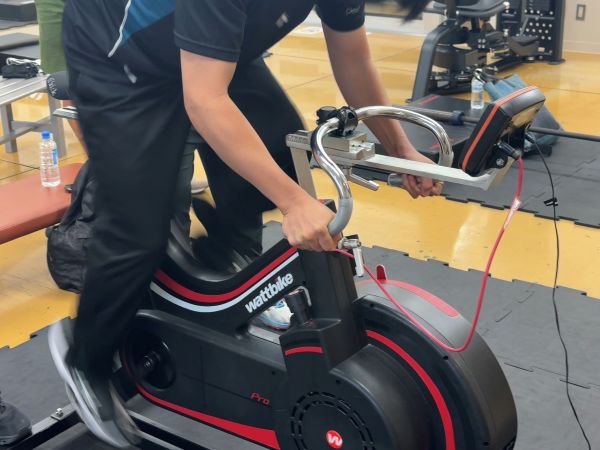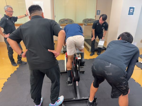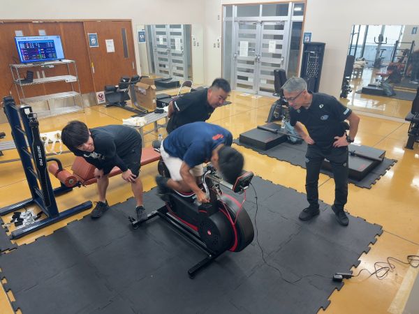 当日は、日本競輪選手養成所の職員の方に加え、現役の競輪選手の方にもお越しいただき、6秒間の全力測定を通して瞬間的な最大出力(ワット値)を計測する専門的なプログラムが行われました。学生たちは自分の最大パワーに挑戦するだけでなく、現役の競輪選手によるハイレベルな測定を間近で見ることができ、その圧倒的なパワーに驚きの声が上がりました。