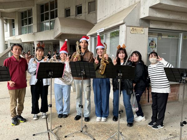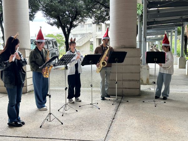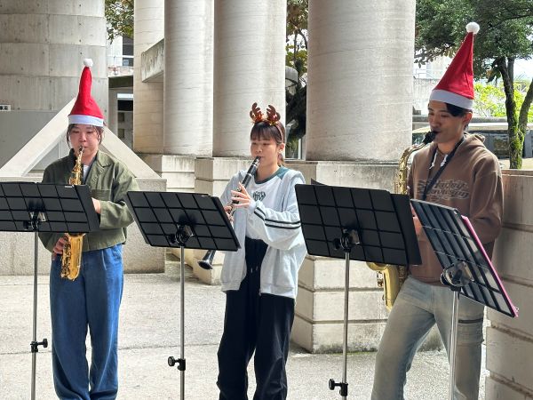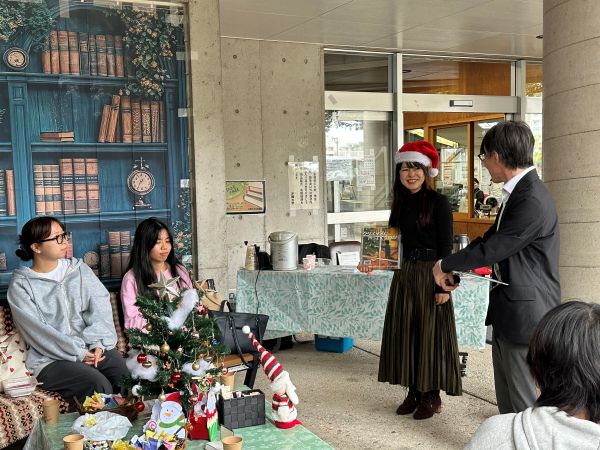 イベントでは最初に、先日行われたアンサンブルコンテストで上位入賞をした吹奏楽部によるクリスマスソングの演奏が行われ一気に図書館前はクリスマスムード一色に包まれました。その後、図書館職員の川畑清美さんによる絵本「クリスマスにやってくるのは?」の読み聞かせが行われました。図書館スタッフが手挽きで淹れた珈琲やお菓子も振舞われました。川畑さんの声色に素敵な絵が相まって、参加者たちは静かなひと時を満喫、昼休みの楽しいイベントとなりました。