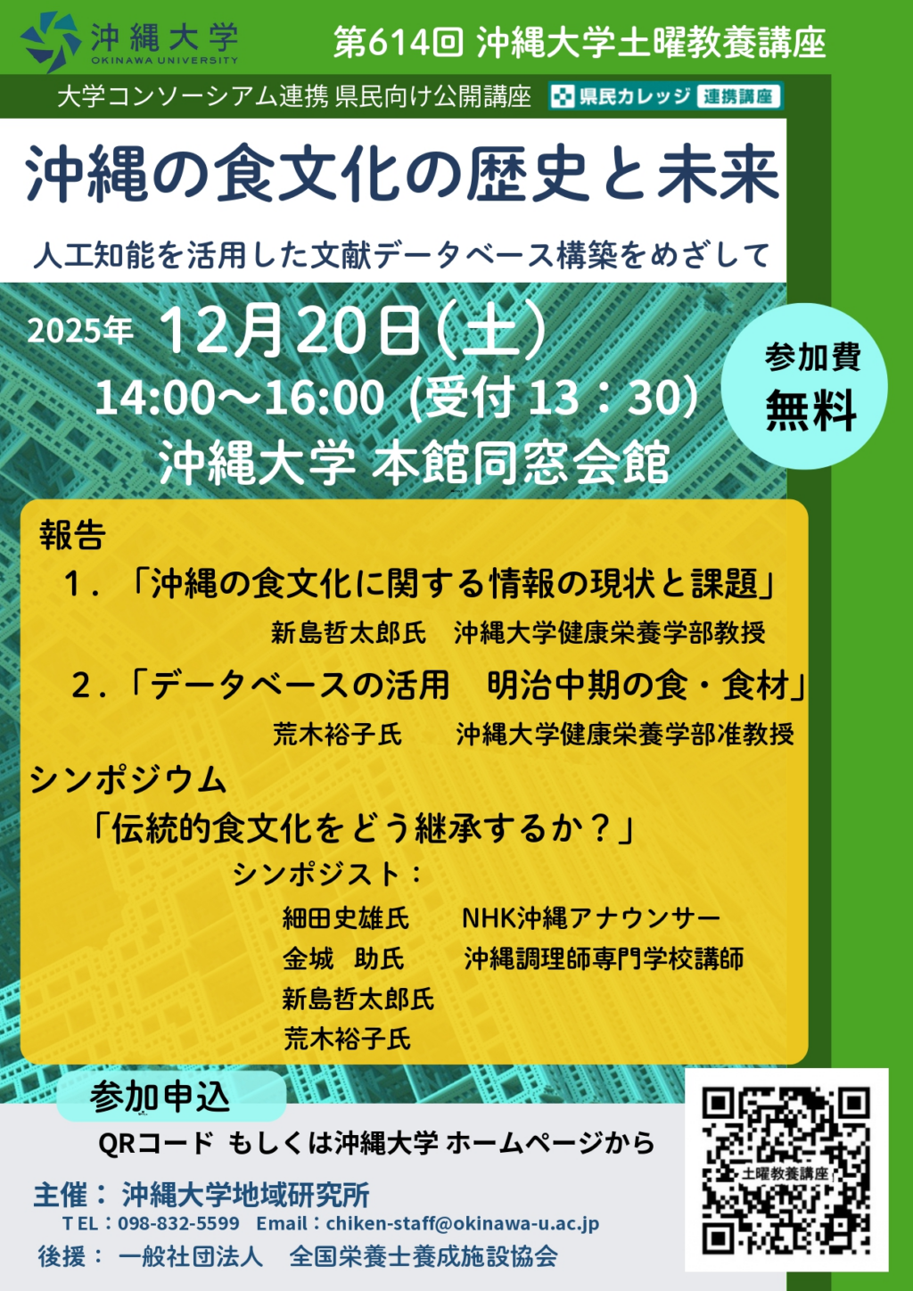 第614回沖縄大学土曜教養講座「沖縄の食文化の歴史と未来─人工知能を活用した文献データベース構築をめざして─」 開催のお知らせ 12月20日(土)14:00~16:00