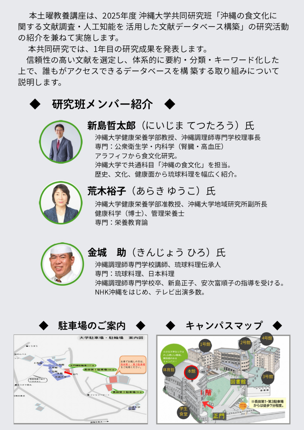 ●開催趣旨:本土曜教養講座は、2025年度沖縄大学共同研究班「沖縄の食文化に関する文献調査・人工知能を活用した文献データベース構築」の研究活動の紹介を兼ねて実施します。
