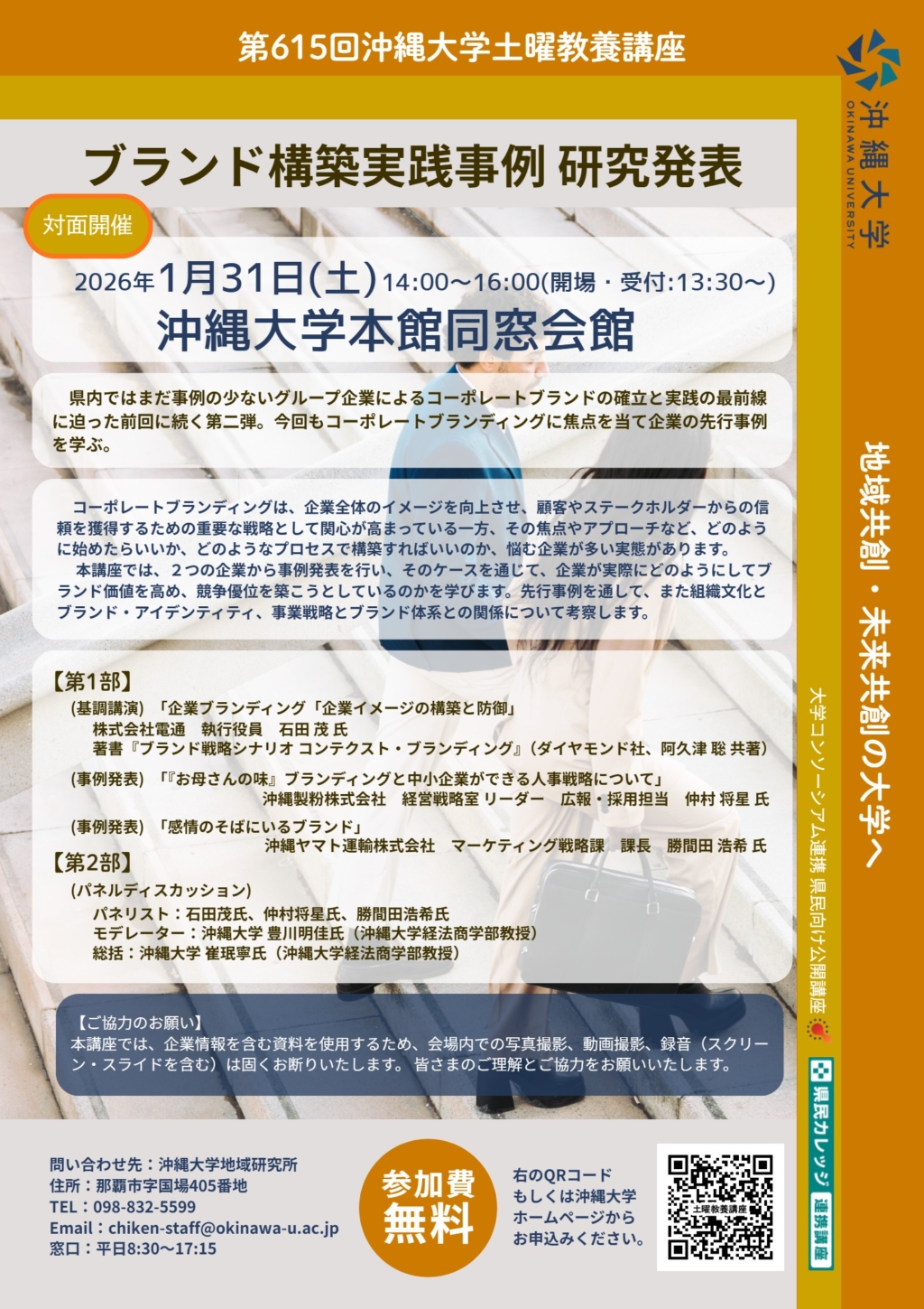 第615回沖縄大学土曜教養講座「ブランド構築実践事例 研究発表」 開催のお知らせ 1月31日(土)14:00~16:00