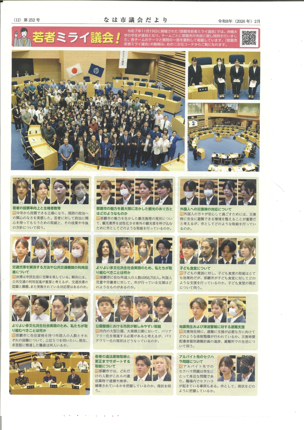 那覇市の広報誌「広報なは」2月号に本学学生たちが議員役を務め、那覇市の市政に関して質問を行った若者ミライ議会(2025年11月19日開催)の様子が掲載されました。