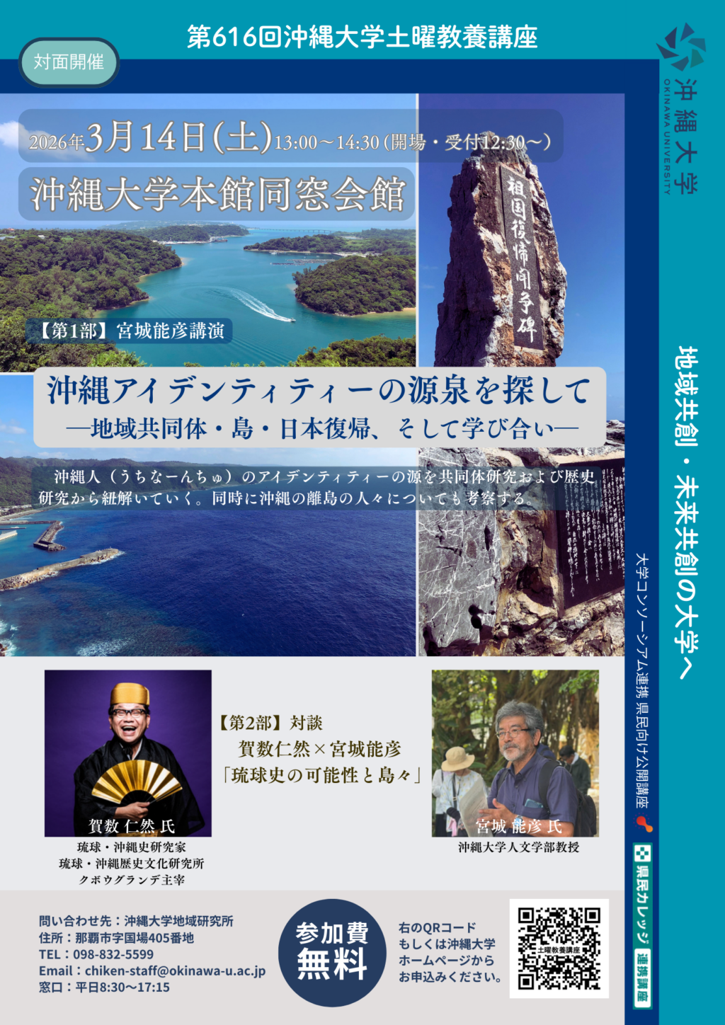 第616回沖縄大学土曜教養講座「沖縄アイデンティティーの源泉を探して─地域共同体・島・日本復帰、そして学び合い─」のお知らせ3月14日(土)13:00~14:30