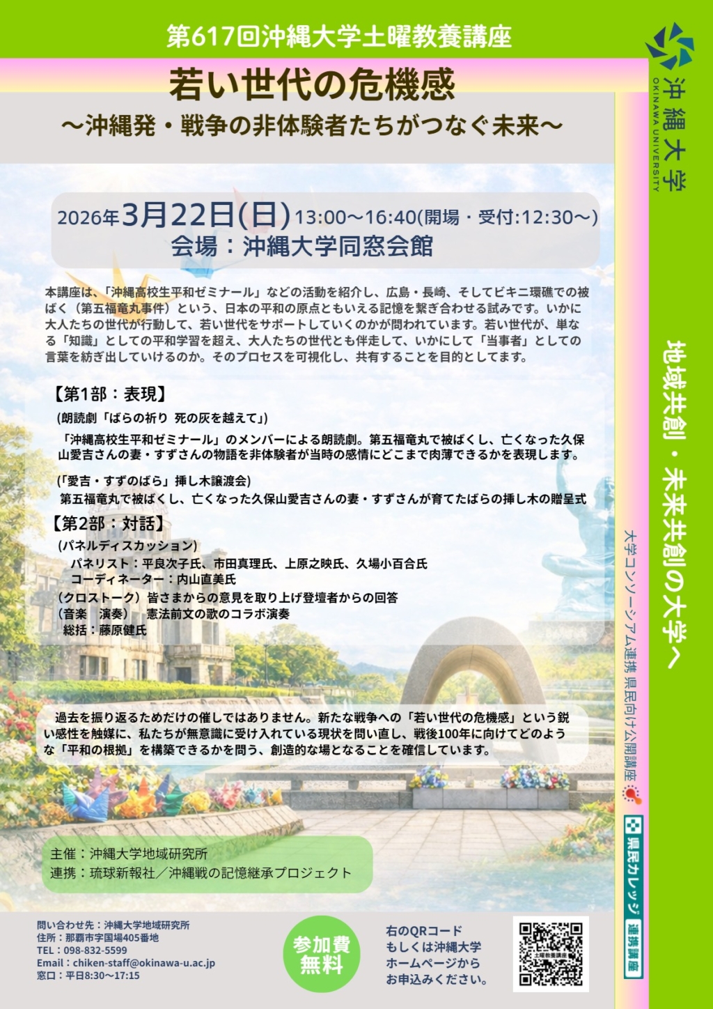 第617回沖縄大学土曜教養講座「若い世代の危機感~沖縄発・戦争の非体験者たちがつなぐ未来~」のお知らせ3月22日(日)13:00~16:40
