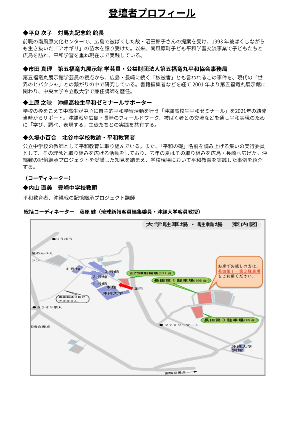●開催趣旨:本講座は、「沖縄高校生平和ゼミナール」などの活動を紹介し、広島・長崎、そしてビキニ環礁での被ばく(第五福竜丸事件)という、日本の平和の原点ともいえる記憶を繋ぎ合わせる試みです。いかに大人たちの世代が行動して、若い世代をサポートしていくのかが問われています。若い世代が、単なる「知識」としての平和学習を超え、大人たちの世代とも伴走して、いかにして「当事者」としての言葉を紡ぎ出していけるのか。そのプロセスを可視化し、共有することを目的としています。